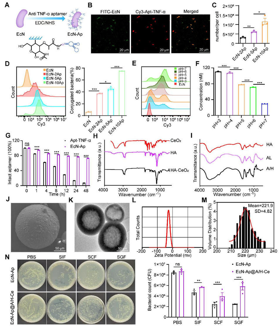 2、通过将TNF-α适配体偶联到大肠杆菌Nissle 1917(EcN)表面,经微流控技术封装于尺寸均一的pH响应性海藻酸钠微球中,再通过液界面自组装形成含透明质酸(HA)和CeO₂纳米酶的外层复合涂层,构建双层微胶囊系统。