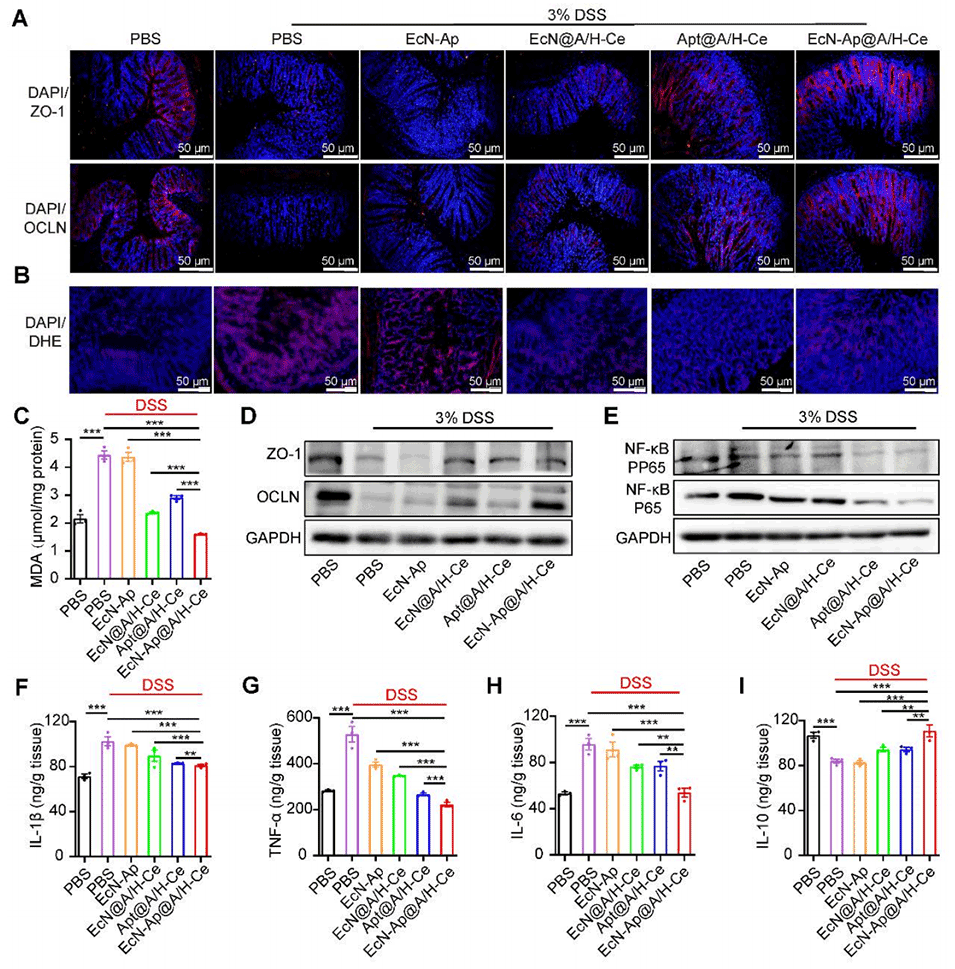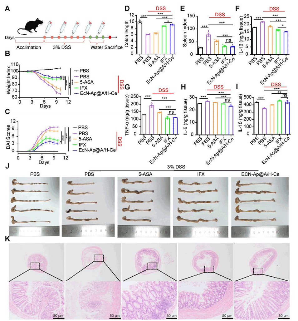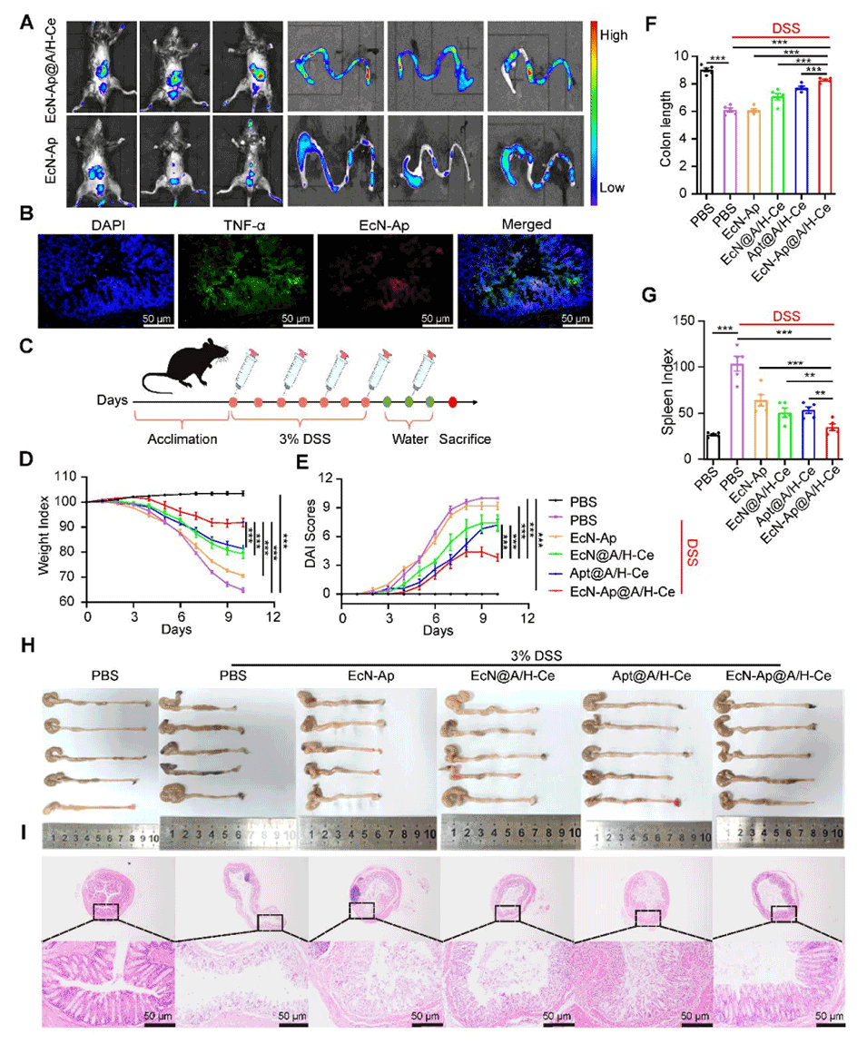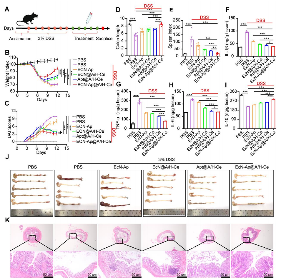 图3. EcN-Ap@A/H-Ce对DSS诱导的小鼠结肠炎的治疗效果