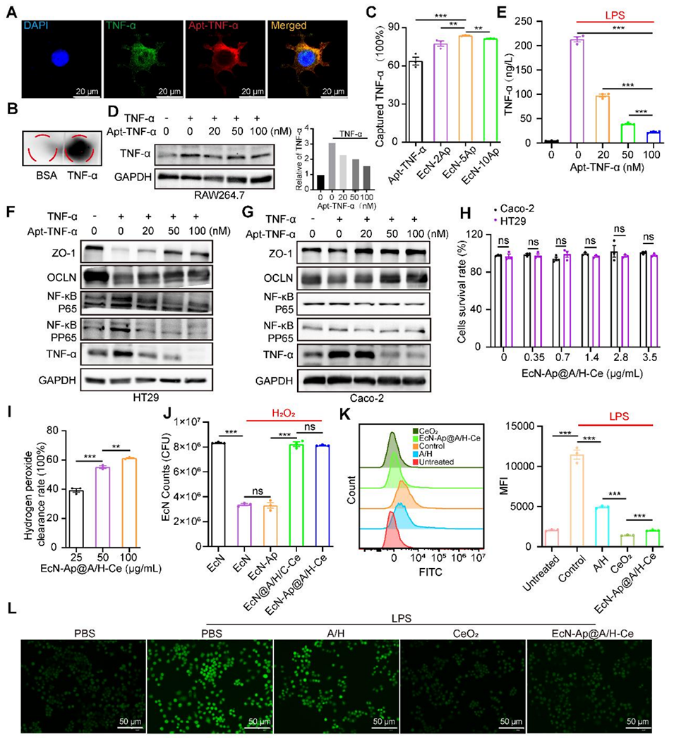 图2. EcN-Ap@A/H-Ce的体外TNF-α捕获能力及活性氧(ROS)清除能力