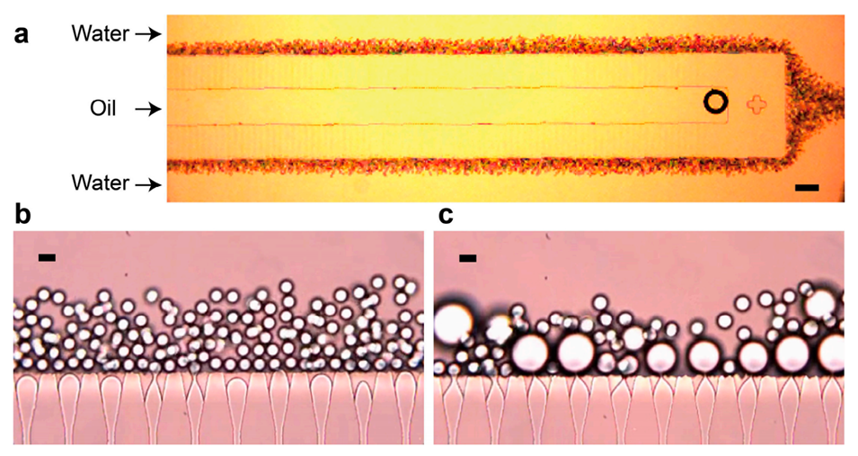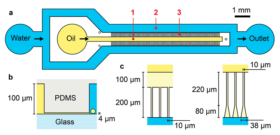 装置采用 “千足虫” 构型,包含深中心通道(引入分散相)、深侧通道(引入连续相并收集液滴)以及浅喷嘴阵列(连接两者),形成阶梯式的深度差异(喷嘴高度4μm,周围通道深度100μm)。这种结构通过拉普拉斯压力梯度(界面张力驱动)或粘性剪切作用,引导分散相与连续相在喷嘴处相互作用,触发液滴的形成与脱离。