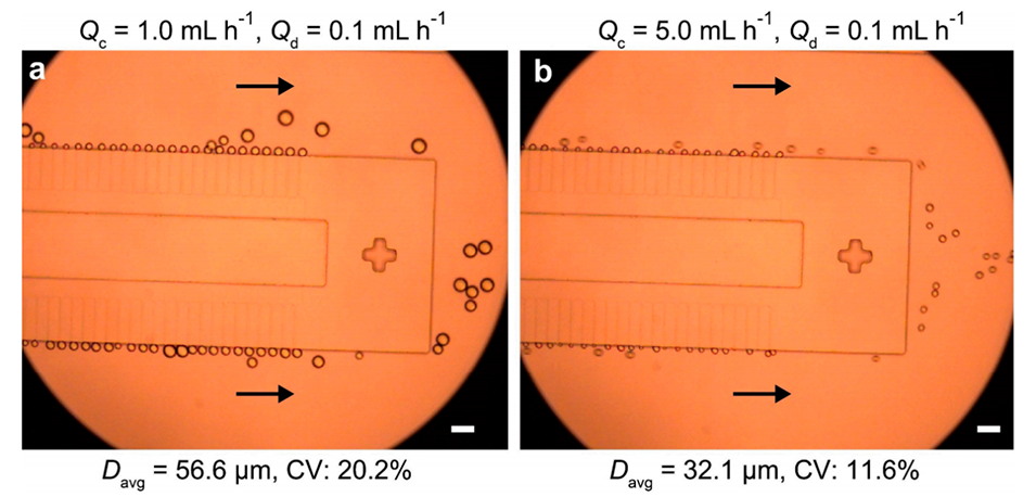 图 3. 直喷嘴装置生成多分散 O/W 液滴的情况。(a)分散相流速(Qd)为 0.1 mL h⁻¹、连续相流速(Qc)为 1.0 mL h⁻¹ 时的液滴生成情况。(b)相同 Qd 下,Qc 为 5.0 mL h⁻¹ 时的液滴生成情况。箭头指示连续相的流动方向。比例尺:100 μm。