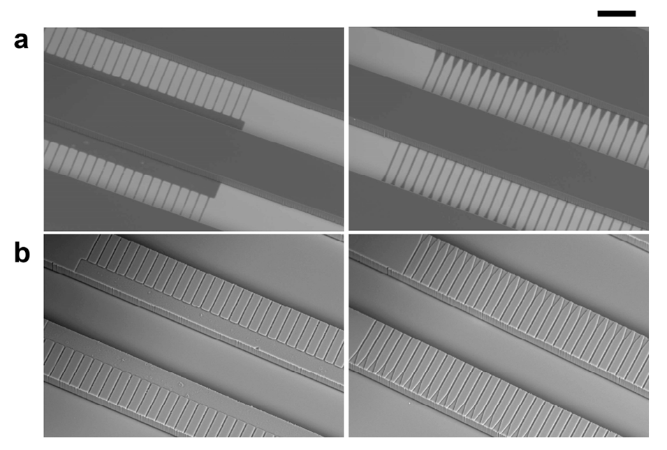 图 2. (a)母模和(b)在 PDMS 芯片中复制的微通道的扫描电子显微镜(SEM)图像,分别对应带有直喷嘴(左)和三角形喷嘴(右)的 SE 装置。比例尺:200 µm。