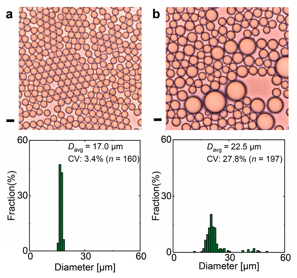 图 5. 从三角形喷嘴装置收集的 O/W 液滴的显微照片和尺寸分布。液滴生成时的 Qc=5.0 mL h⁻¹,Qd 分别为(a)0.1 mL h⁻¹、(b)0.7 mL h⁻¹。比例尺:20 μm。