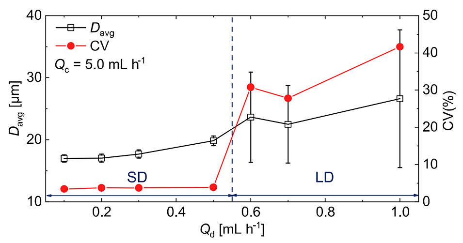 图 6. 使用三角形喷嘴装置生成的O/W滴液在 SD 和 LD 模式下的平均滴液直径(Davg)和变异系数(CV)的变化情况。实验中,分散相流速 Qd 从 0.1 mL h⁻¹ 变化为 1.0 mL h⁻¹,而 Qc 保持为 5.0 mL h⁻¹ 不变。