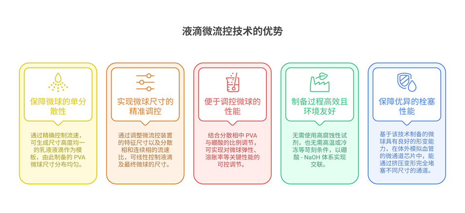 1、本研究开发了一种基于液滴微流控的新策略,用于简便制备单分散聚乙烯醇(PVA)微球,其尺寸和弹性可控,适用于栓塞治疗。