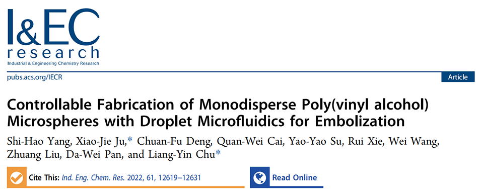 栓塞治疗通过将栓塞材料注入血管阻断肿瘤血供或控制出血,其疗效依赖于栓塞材料的性能。现有制备PVA微球的方法(如乳化交联、喷雾干燥、冻融法等)存在尺寸不均、能耗高、周期长、难以控制弹性等问题。鉴于此,四川大学褚良银教授、巨晓洁教授等人开发出一种基于液滴微流控的新策略,制备具有可控尺寸、弹性及良好性能的单分散PVA微球,用于栓塞治疗。相关研究以“Controllable Fabrication of Monodisperse Poly(vinyl alcohol) Microspheres with Droplet Microfluidics for Embolization”为题目,发表在期刊《Industrial & Engineering Chemistry Research》上。