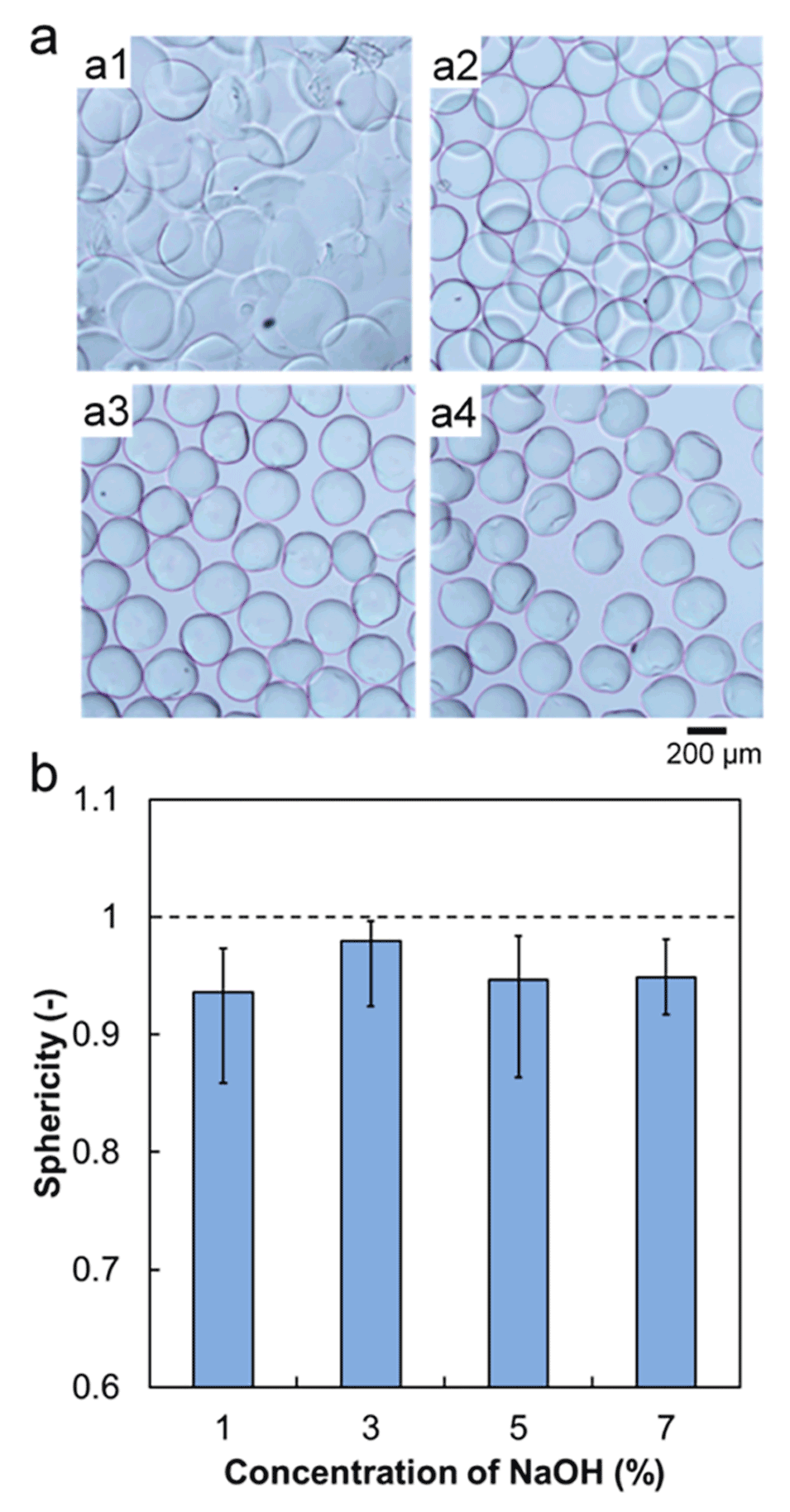 图 2. 接收溶液中NaOH浓度对PVA微球结构的影响。(a) NaOH浓度为1%(a1)、3%(a2)、5%(a3)、7%(a4)时制备的交联PVA微球的光学显微照片。(b) 不同NaOH浓度下制备的PVA微球的球形度,图中数据为平均值,误差棒代表数据与平均值的最大和最小偏差。接收溶液高度为9 cm,接收溶液转速为0.785 rad/s。