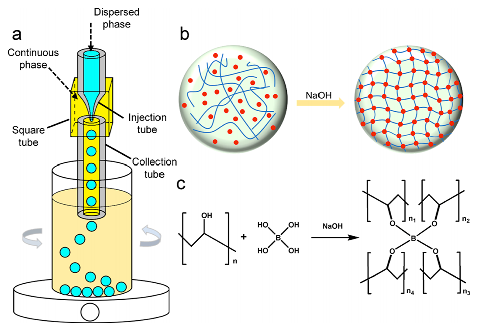 图 1. 用于制备单分散PVA微球的微流控装置及交联原理示意图。(a) 用于生成PVA微球的微流控装置。(b) 添加NaOH触发模板液滴内聚乙烯醇化学交联的示意图。(c) 分子层面上PVA与硼酸之间化学交联的原理。
