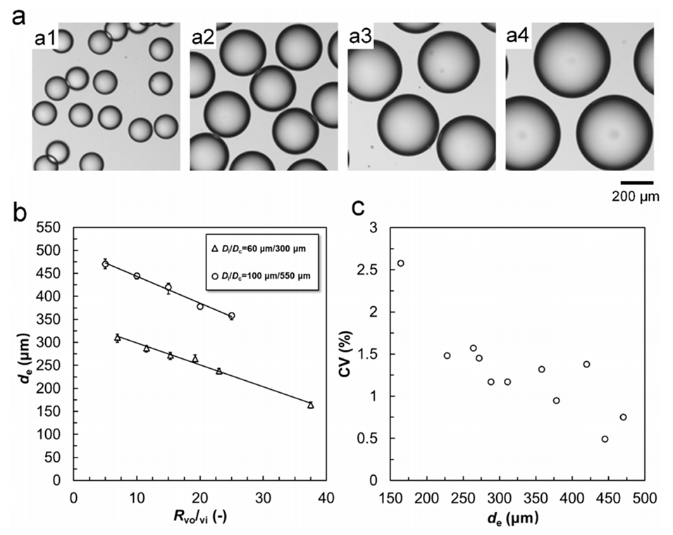 图 5. 微流控装置特征尺寸及内外流体流速对模板液滴尺寸的影响。(a) 平均直径为158 μm(a1)、288 μm(a2)、378 μm(a3)、470 μm(a4)的单分散模板液滴的光学显微照片。(b) 外流体与内流体流速比(Rvo/vi)及微流控装置尺寸(Di/Dc)对模板液滴尺寸的影响,图中数据为平均值,误差棒代表数据与平均值的最大和最小偏差。(c) 不同平均尺寸(de)模板液滴的变异系数(CV)。