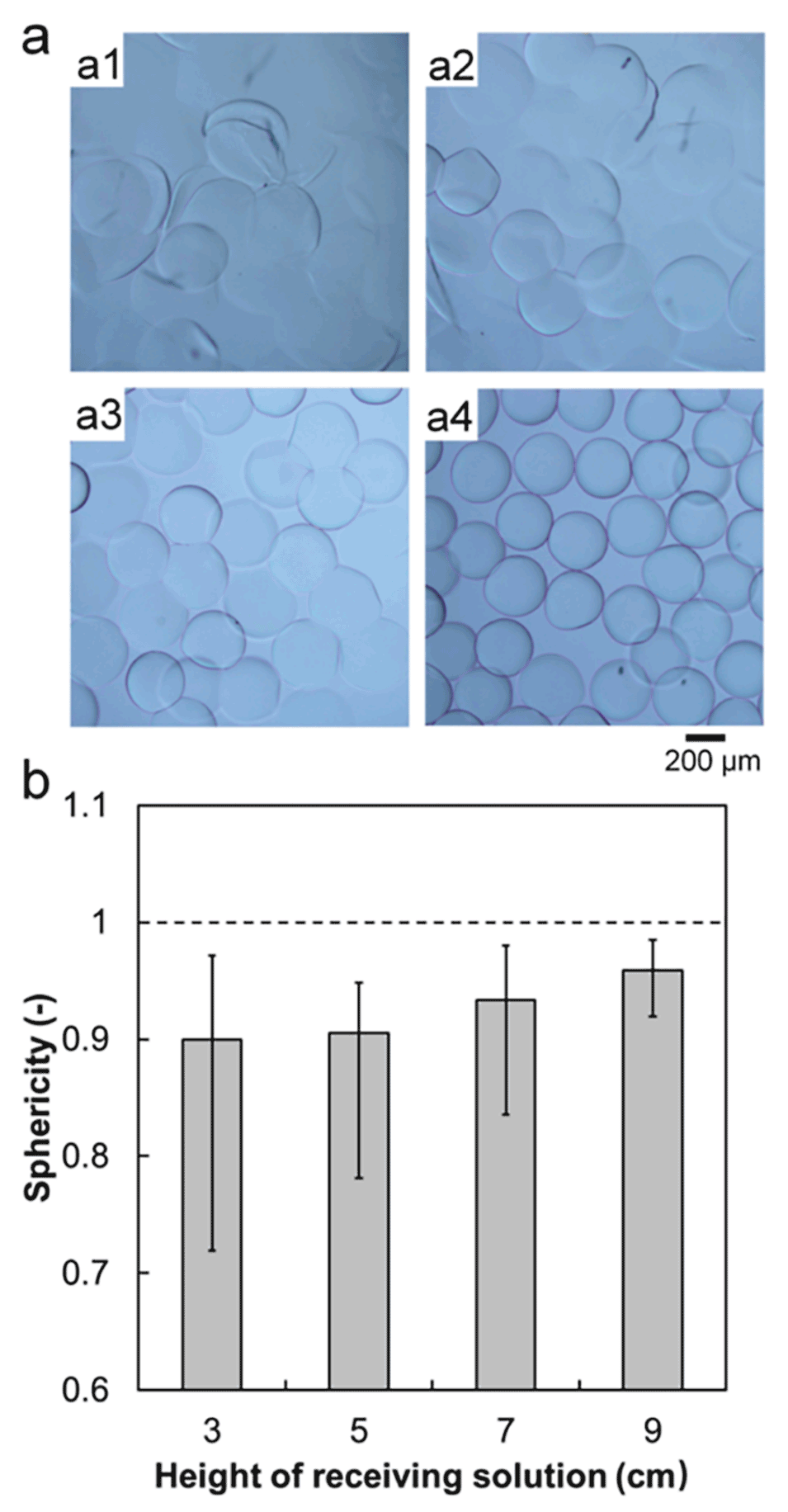 图 3. 接收溶液高度对PVA微球结构的影响。(a) 接收溶液高度为3 cm(a1)、5 cm(a2)、7 cm(a3)、9 cm(a4)时制备的交联PVA微球的光学显微照片。(b) 不同接收溶液高度下制备的PVA微球的球形度,图中数据为平均值,误差棒代表数据与平均值的最大和最小偏差。接收溶液中NaOH浓度为3%,接收溶液转速为0.785 rad/s。