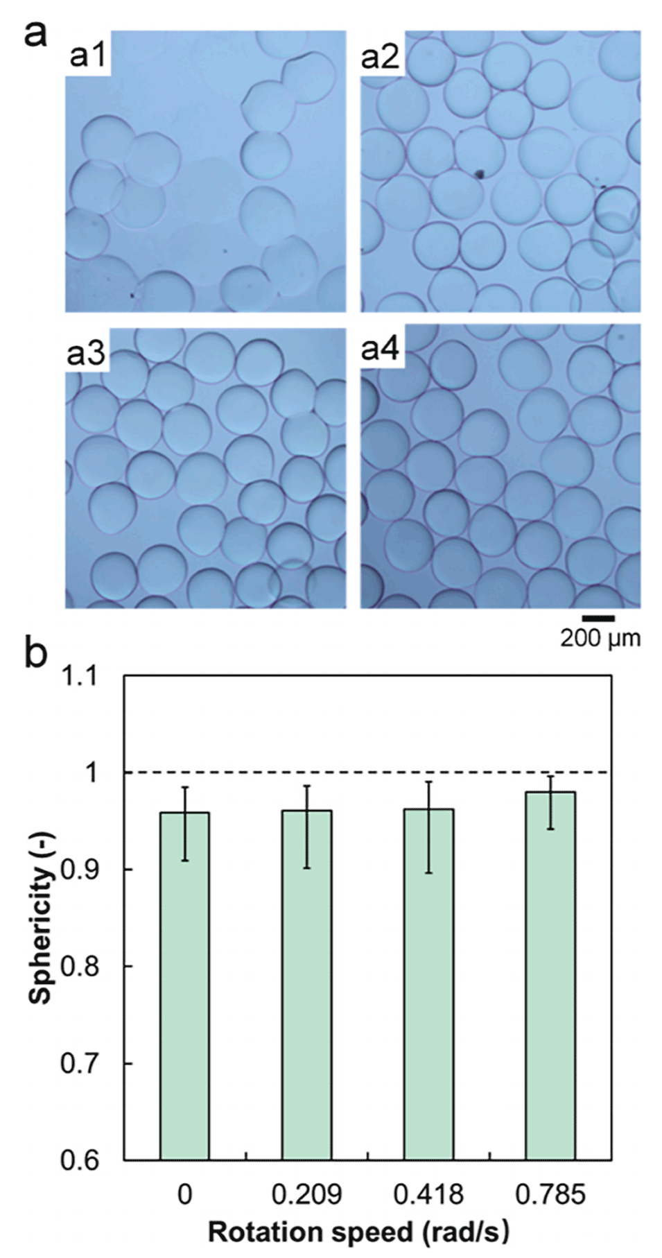 图 4. 接收溶液转速对PVA微球结构的影响。(a) 接收溶液转速为0 rad/s(a1)、0.209 rad/s(a2)、0.418 rad/s(a3)、0.785 rad/s(a4)时制备的交联PVA微球的光学显微照片。(b) 不同接收溶液转速下制备的PVA微球的球形度,图中数据为平均值,误差棒代表数据与平均值的最大和最小偏差。接收溶液中NaOH浓度为3%,接收溶液高度为9 cm。
