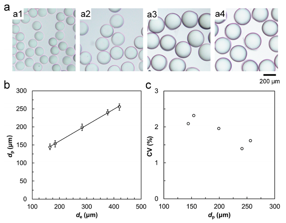图 6. PVA液滴模板尺寸对交联PVA微球尺寸的影响。(a) 平均直径为144 μm(a1)、195 μm(a2)、240 μm(a3)、256 μm(a4)的交联单分散PVA微球的光学显微照片。(b) 液滴模板尺寸(de)对交联PVA微球尺寸(dp)的影响,图中数据为平均值,误差棒代表数据与平均值的最大和最小偏差。(c) 不同平均尺寸(dp)交联PVA微球的变异系数(CV)。