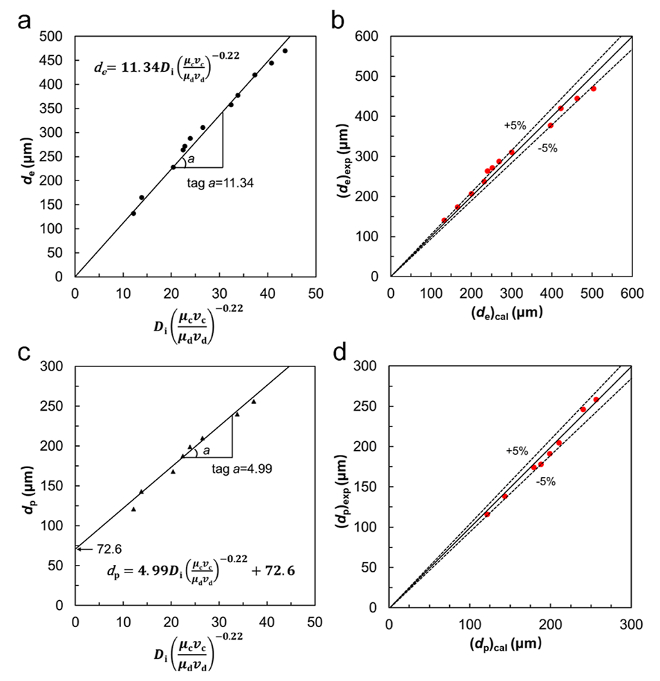 图 7. 连续相和分散相流体的黏度、流速以及注射管锥形孔内径对PVA液滴模板和交联PVA微球尺寸的影响。(a, b) 连续相和分散相流体的黏度、流速以及注射管锥形孔内径对模板液滴尺寸的影响(a),以及模板液滴计算尺寸与实验尺寸的误差分析(b)。(c, d) 连续相和分散相流体的黏度、流速以及注射管锥形孔内径对交联PVA微球尺寸的影响(c),以及交联PVA微球计算尺寸与实验尺寸的误差分析(d)。