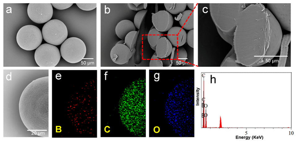图 8. (a) PVA微球的扫描电镜图像。(b, c) PVA微球横截面的扫描电镜图像,其中(c)是(b)的放大图像。(d-h) 交联PVA微球的元素分析,其中(d)为扫描电镜图像,(e-g) 为硼、碳、氧元素的EDS元素映射图像,(h) 为元素的能谱图。