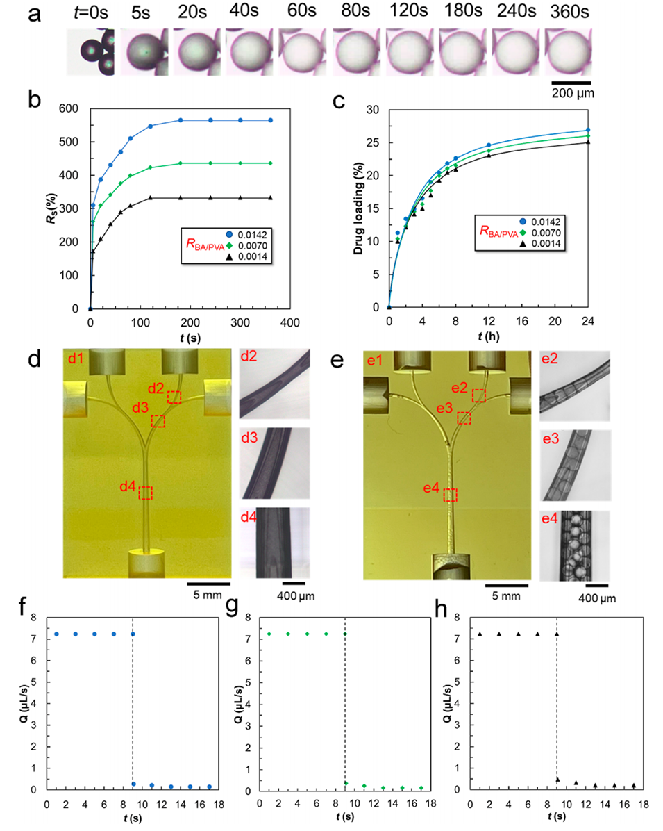 图 10. (a) PVA微球在水中不同时间间隔的溶胀过程光学显微照片。(b) RBA/PVA值对PVA微球在水中溶胀率的影响。(c) RBA/PVA值对以阿霉素为模型药物的PVA微球载药量的影响。(d) 体外栓塞芯片的光学显微镜图像(d1)和显微照片(d2-d4),该芯片由三部分尺寸逐渐减小的微通道组成,包括一个主干微通道(d4)、两个中间分支微通道(d3)和四个末端微通道(d2)。(e) 向微通道中注入PVA微球后体外栓塞芯片的光学显微镜图像(e1)和显微照片(e2-e4),其中三部分微通道均充满了PVA微球(e2-e4)。在芯片最小的末端微通道(e2)中,PVA微球被挤压变形,实现完全栓塞。(f-h) RPB/PVA值分别为0.0142(f)、0.0070(g)、0.0014(h)的PVA微球注入前后体外栓塞芯片微通道的水通量。