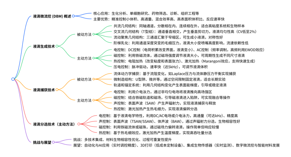 1、本综述全面概述了液滴微流控技术(DBM)中液滴生成、捕获和分选的被动与主动策略及其最新进展。