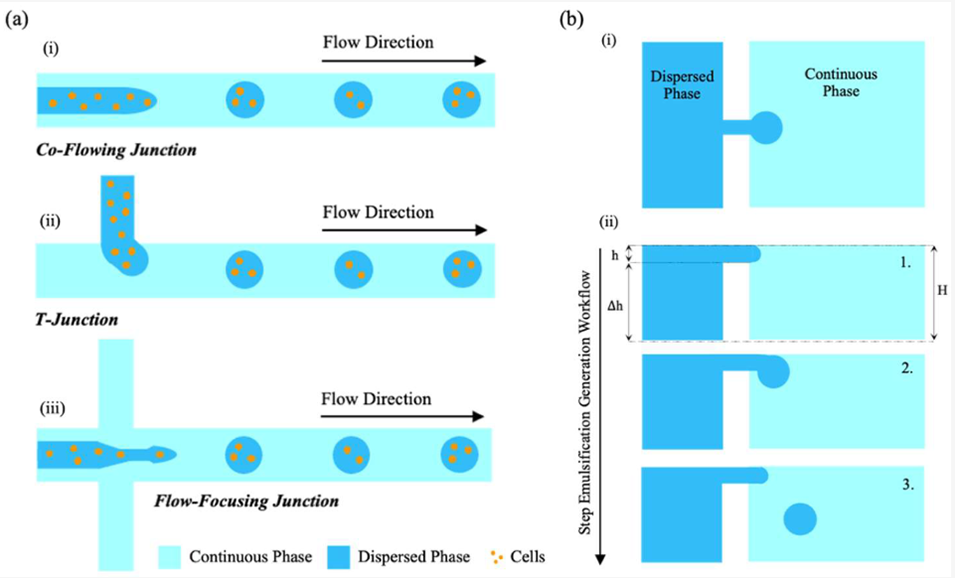 图 2:细胞负载微胶囊生成与阶梯乳化机制。(a)基于液滴的微流控生成细胞负载水凝胶微胶囊的三种基本装置示意图:(i)同轴装置、(ii)T 型结装置、(iii)流动聚焦结装置;(b)阶梯乳化机制示意图:(i)微流控结构俯视图(分散相经浅喷嘴流入连续相填充的深储层)、(ii)侧视图(液滴形成的横截面序列)。