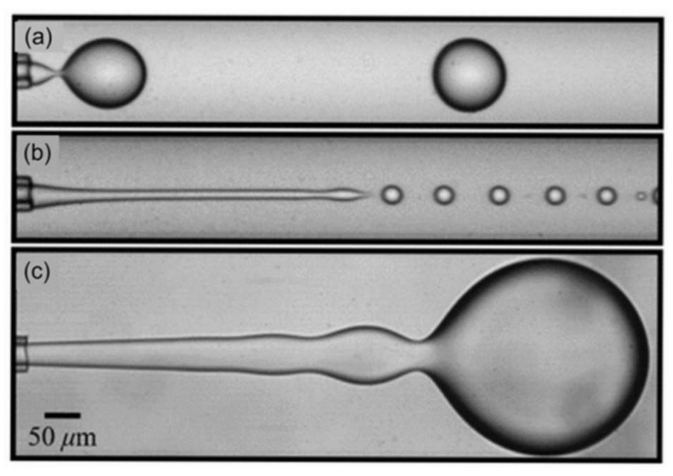图 1:展示共流方法中三种液滴生成状态:(a)滴落状态、(b)窄喷射状态、(c)宽喷射状态,呈现不同流态下的液滴形成特征。