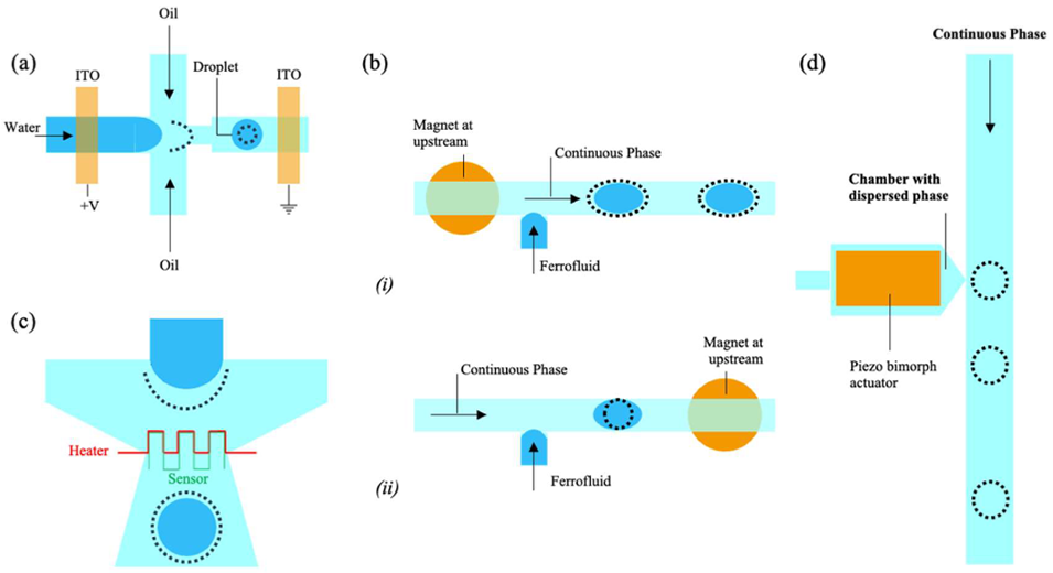图 3:主动法液滴生成示意图。(a)施加直流电压生成液滴的示意图;(b)带铁磁流体和磁铁的 T 型结装置(i)磁铁在上游位置、(ii)磁铁在下游位置;(c)研究液滴形成过程温度依赖性的微流控装置示意图;(d)按需分配液滴的微流控芯片:压电致动器将水性液滴释放到含不互溶流体的垂直通道中。