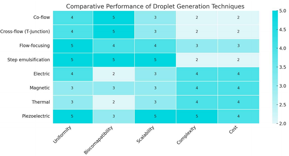 图 4:液滴生成技术性能比较热图。基于五个性能指标(液滴均匀性、生物相容性、可扩展性/通量、系统复杂度、成本)对液滴生成技术进行定性评分(1 分最差至 5 分最优),对比被动方法(共流、交叉流/ T 型结、流动聚焦、阶梯乳化)和主动方法(电、磁、热、压电),展示各方法的优势与权衡,为特定应用选择提供参考。