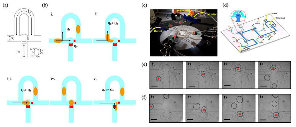 图 6:流体动力学阻力变化的捕获过程。(a)用于捕获设计的微通道尺寸;(b)液滴捕获场景:(i)流速 QB 和 QT;(ii)液滴进入旁路通道而非陷阱;(iii,iv)液滴进入陷阱;(v)液滴进入陷阱并推入稀释流;(c)实验装置(PVC 管上的长尾夹用于开关与陷阱连接的侧通道);(d)通过流体动力学阻力调节实现按需液滴捕获的微流控装置示意图(液滴经流动聚焦结生成,打开对应长尾夹时被导入侧陷阱,关闭则固定);(e,f)微流控装置中不同陷阱按需捕获液滴的序列图像(红色星号标记被捕获液滴)。