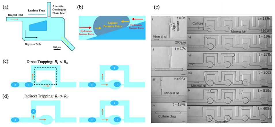 图 5:压力变化与旁路通道的捕获过程。(a)Laplace 陷阱的主要特征;(b)力平衡示意图(液滴界面的 Laplace 压力(黄色)与微通道中连续相的静水压力(红色),箭头大小表示力的大小);(c)直接捕获法(Rl <Ru)的液滴捕获;(d)间接捕获法(Rl> Ru)的液滴捕获;(e)时间标记图像展示单个藻类培养栓(i–iv)和液滴阵列(v–x)的形成过程。
