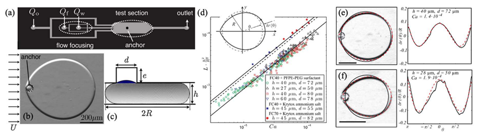 图 8:轨道与锚定系统的捕获。(a)含流动聚焦器(生成油包水)和单个锚定装置的微通道示意图;(b)锚定液滴在外部平均流 U 作用下保持位置的俯视图;(c)微通道中锚定液滴(外半径 R)的 Surface Evolver 渲染图(锚定装置直径 d、深度 e,通道高度 h);(d)静态半径 R 下变形 δr (θ) 的极坐标草图;(e,f)左侧:油流中锚定液滴变形的图像(虚线为方程 11 的预测,实线为半径 R 的等效圆);右侧:显微镜图像提取的 δr (θ)/R(实线)与方程 11 的理论曲线(虚线,以 9 为系数)的对比。