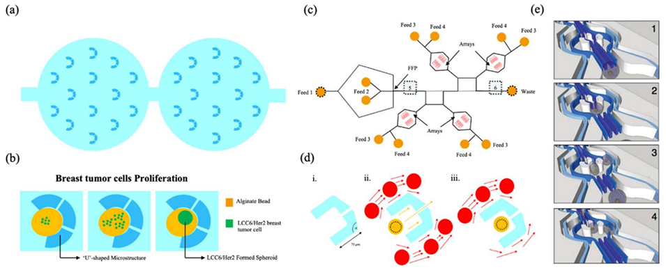 图 7:U 型微结构的捕获过程。(a)微流控芯片微筛中捕获的藻酸盐珠(每个珠加载时含约 100 个细胞);(b)LCC6/Her2 乳腺癌细胞在藻酸盐珠中增殖形成多细胞球体的示意图;(c)用于液滴生成、捕获、培养、监测和释放的四陷阱阵列微流控装置示意图(液滴在流动聚焦点形成,稳定后经 Feed 3 抽去油相导入陷阱阵列);(d)液滴捕获阵列:(i)单个陷阱设计(尾部设有 110°角,提升液滴回收率至 90% 以上);(ii)液滴接近陷阱的流动剖面;(iii)液滴被捕获时的流动剖面(其他液滴绕过已占用陷阱,确保单液滴捕获);(e)时间分辨的捕获机制草图(深蓝色表示通道中部流速快,浅蓝色表示壁面流速慢)。