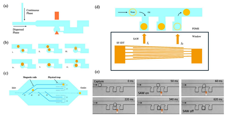 图 9:主动捕获技术示例。(a)含通道、微孔和电极的微流控平台结构示意图(阴影区域为嵌入的电极);(b)捕获液滴与经过的液滴的融合过程(i–iii)、融合液滴再次被捕获(iv–vi)、关闭电场后无融合发生(6);(c)结合磁轨道(蓝色)和物理陷阱(灰色)的微流控装置示意图(磁液滴(橙色)在磁场激活时沿轨道进入陷阱,磁场关闭后仍被保留,可实现精准按需路径规划、捕获、释放和融合);(d)声微流控液滴捕获释放装置示意图(含 PDMS 通道和带斜叉指换能器(SF-IDT)的压电基底,通过声辐射力(ARF)捕获/释放液滴,调谐驱动频率可调整 SAW 光束位置);(e)SF-IDT 的液滴捕获释放实验图像(橙色箭头表示 SAW 激活)。