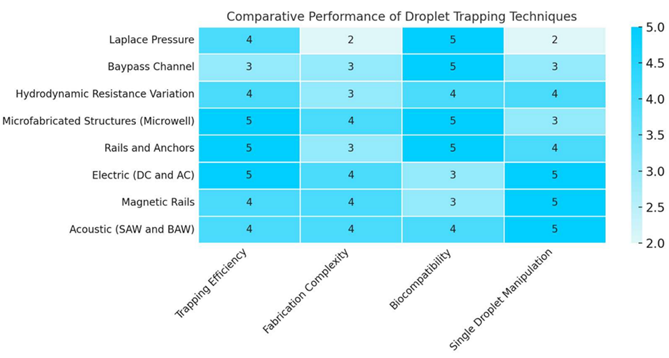 图 10:液滴捕获技术比较评估。基于四个评估标准(捕获效率、制造复杂度、生物相容性、单液滴操控能力)对液滴捕获技术评分(1 分最差至 5 分最优),对比被动方法(Laplace 压力陷阱、旁路通道结构、流体动力学阻力调节、微孔结构)和主动技术(电(DC 和 AC)、磁轨道、声(SAW 和 BAW)系统),反映代表性研究的综合性能。