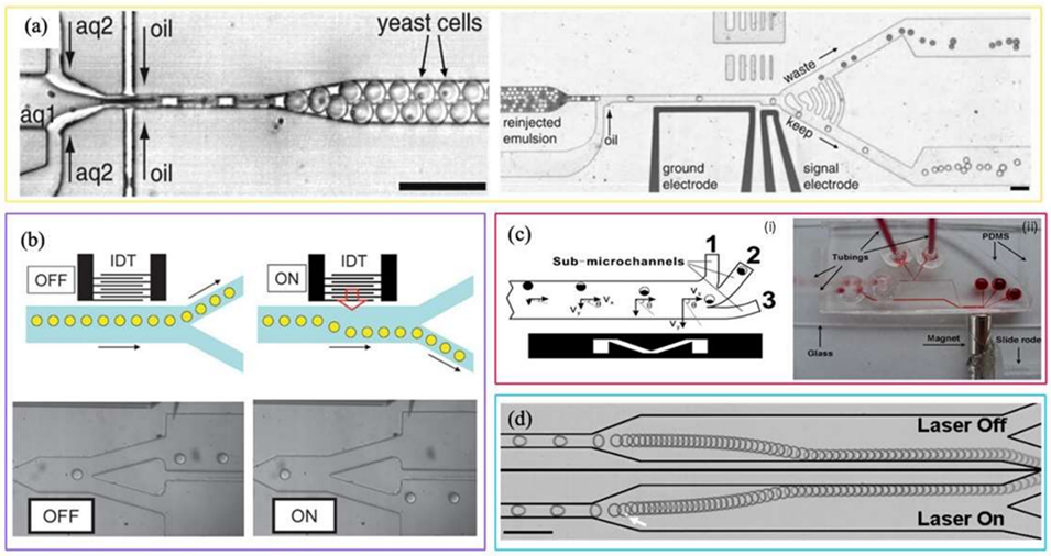 图 12:主动分选技术示例。(a)超高通量微流控筛选平台的模块;(b)混合 PDMS-SAW 芯片示意图:液滴生成单元和与 SAW 装置耦合的分支 PDMS 通道(SAW 关闭时液滴因低流阻流入上通道,开启时 IDT 的声流将液滴导向下通道);(c)(i)液滴速度分量示意图(Vx 为 x 方向速度,Vy 为 y 方向速度);(ii)微通道中超顺磁液滴偏转的示意图(磁力与阻力沿 y 轴反向作用,靠近磁铁处更强的磁力使纳米颗粒向下移动,形成液滴顶部白色(水)、底部橙色(纳米颗粒)的分层);(d)局部热毛细驱动的液滴切换连续帧叠加图(箭头表示通过水-染料溶液的荧光观察到的激光位置)。