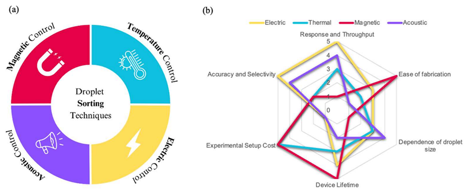 图 11:主动分选技术示例。(a)主要分选策略及其分类概述;(b)基于六个性能指标(i)响应时间与通量、(ii)制造难易度、(iii)设备成本、(iv)准确性与选择性、(v)装置寿命、(vi)对液滴大小的依赖性,对不同液滴分选方法的评分对比(1 分至 5 分,5 分为最优)。