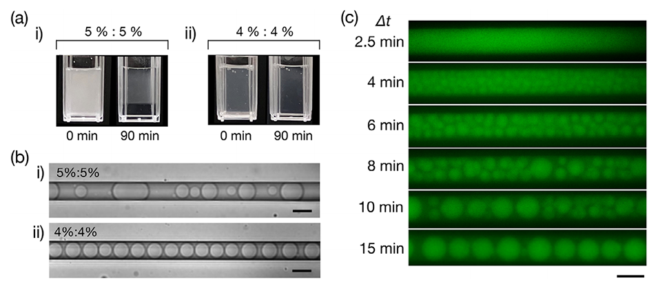 图 2. 浓度依赖性和自发液滴形成的显微镜观察。a) 机械搅拌后静置条件下 PEG/DEX 水溶液的相行为。5%:5%(w/v)的 PEG/DEX 溶液发生相分离(i),而 4%:4%(w/v)的溶液未观察到明显分离(ii)。每个比色皿宽度为 1cm。b) 自发形成液滴的显微镜图像。明场图像显示注入 4%:4%(w/v)PEG/DEX 混合物(i)和 5%:5%(w/v)PEG/DEX 混合物(ii)(均用纯水配制)的结果。4%:4% 混合物中可观察到尺寸均一的富葡聚糖液滴(直径≈20μm)。图像拍摄于注入机械混合溶液后 15 分钟。c) 4%:4%(w/v)PEG/DEX 混合物在微流控通道中缓慢流动(≈5μm・min-1)时的延时荧光显微镜图像,时间点为注入后 Δt=2.5、4、6、8、10 和 14 分钟。液滴随时间推移逐渐形成,最终呈现单排尺寸均一的液滴(直径≈20μm)。通过在 PEG/DEX 溶液中添加 FITC-DEX 实现可视化。比例尺为 20μm。所示图像对应微通道的中间部分。