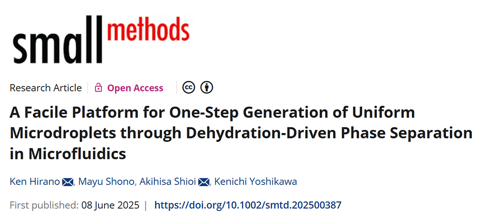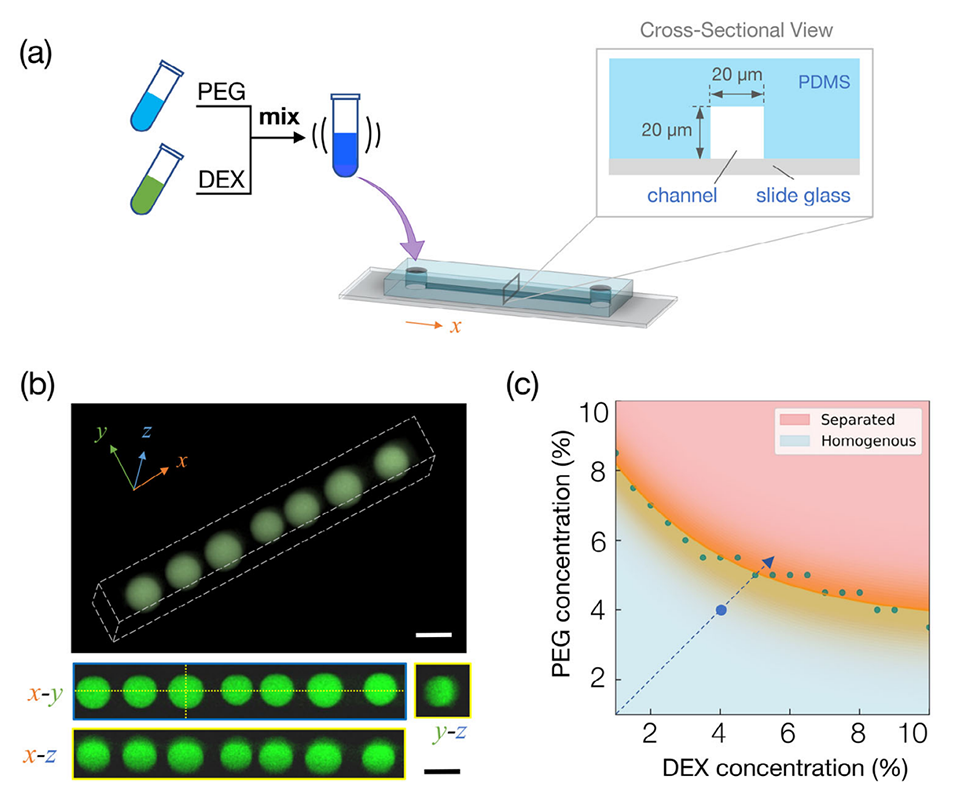 近期,有研究人员开发了一种利用聚二甲基硅氧烷(PDMS)微流控通道的脱水驱动相分离特性,一步生成均匀细胞大小微液滴的简便方法,该方法通过PDMS的吸水作用使聚乙二醇(PEG)和葡聚糖(DEX)的均相混合物发生相分离,可成功包裹多种生物材料。相关研究以“A Facile Platform for One‐Step Generation of Uniform Microdroplets through Dehydration‐Driven Phase Separation in Microfluidics”为题目,发表在期刊《Small Methods》上。