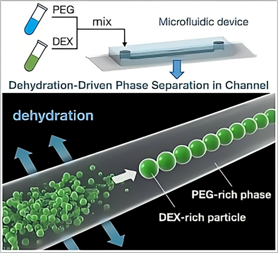 4、均匀液滴形成:相分离一旦发生,体系会自发地进行能量最低化调整。在微通道的限制作用下,富含DEX的区域逐渐聚集形成液滴,这些液滴呈线性排列,分散在富含PEG的连续相中。由于通道尺寸的均匀性以及脱水过程的渐进性和可控性,液滴能够均匀成核和生长。
