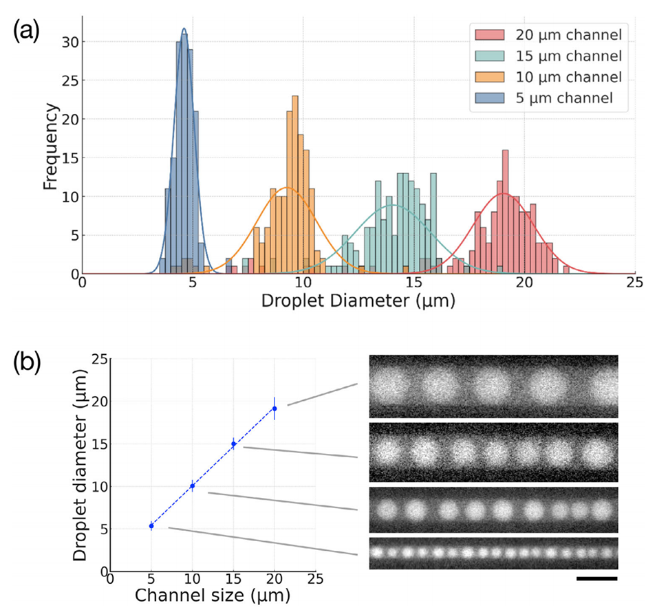 图 3. 通道尺寸对液滴直径的调控。a) 5、10、15 和 20μm 宽的 PDMS 微通道中生成液滴的直径直方图及相应的高斯拟合。每种条件下采用特定的 PEG/DEX 浓度(分别为 1%、2%、3% 和 4%)以优化相分离时间。b) 通道尺寸与液滴平均直径的关系。误差棒表示标准差(每个条件 n=140 个液滴)。右侧为各通道中液滴的代表性荧光图像。比例尺为 20μm。