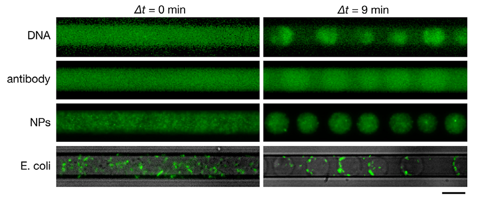 图 4. 富葡聚糖液滴对多种物质的包裹。微流控通道中由 4%:4%(w/v)PEG/DEX 混合物(用 1×PBS 配制)形成的富葡聚糖液滴的荧光显微镜图像,液滴内包裹的物质包括:经 YOYO-1 染色的 T4 噬菌体 DNA(166kbp,≈56μm)、Alexa Fluor 488 标记的抗小鼠 IgG 抗体、200nm 羧基修饰荧光聚苯乙烯微球(纳米颗粒,NPs),以及表达绿色荧光蛋白(GFP)的大肠杆菌(明场与荧光图像叠加)。左列和右列图像分别为 PEG/DEX 混合物注入后即刻的初始状态,以及注入后 9 分钟液滴分离的状态。比例尺为 20μm。