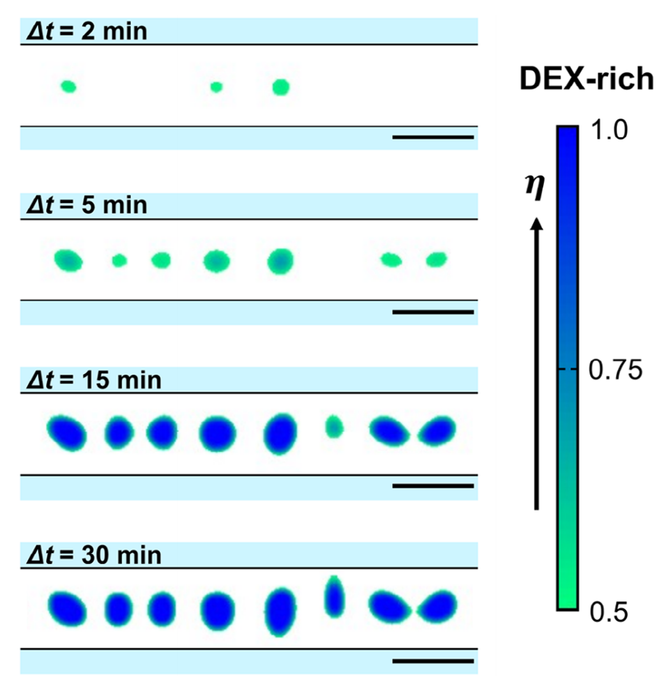 图 5. 微通道内 PEG/DEX 混合物相分离时间演化的数值模拟结果(Δt=2、5、15 和 30 分钟)。数值计算基于模型方程(方程 1-3)进行。实验中微相分离似乎在溶液注入通道的过程中发生,因此数值计算的时间参数设为 Δt = t - 800s,其中 t=0 对应模拟起始时间。颜色图表示 PEG 与 DEX 的比例(η=[0.5,1]),η=1.0 对应 100% DEX(不含 PEG)。比例尺为 20μm。