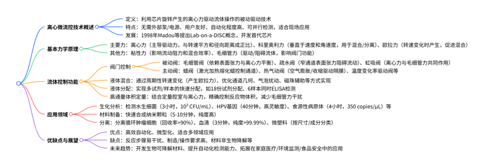 3、最后,讨论了离心微流控技术的优势和局限性,总结了芯片的制造技术,并展望了其未来发展趋势(如生物降解材料、自动化检测和应用领域的拓展等)。