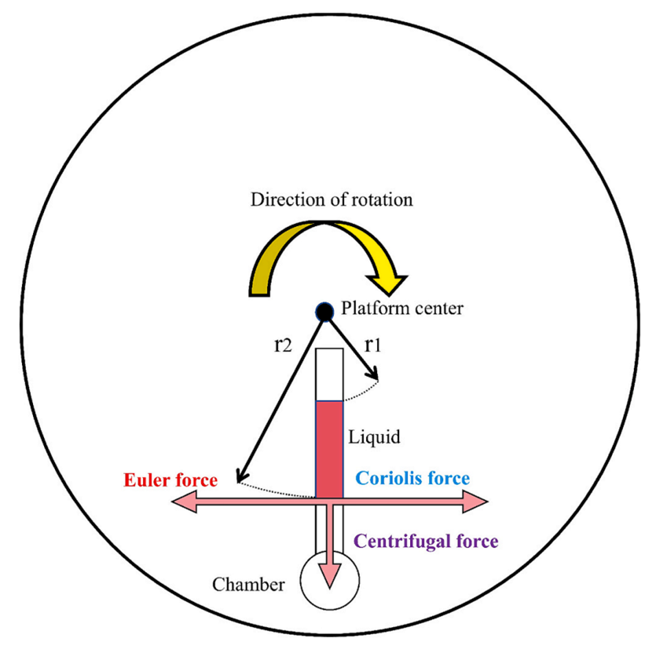 图 1. 离心微流控芯片的典型圆盘结构及作用于液体的三种虚拟力:离心力、科里奥利力和欧拉力。