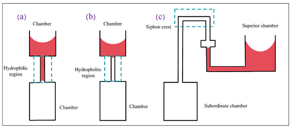 图 2. 三种常见的被动阀:(a)毛细管阀;(b)疏水阀;(c)虹吸阀。