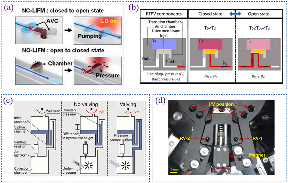图 3. 四种不同类型的主动阀:(a)石蜡阀;(b)热气动阀;(c)温度变化率驱动阀;(d)集成离心穿刺阀、可重复使用阀及磁珠控制阀等。
