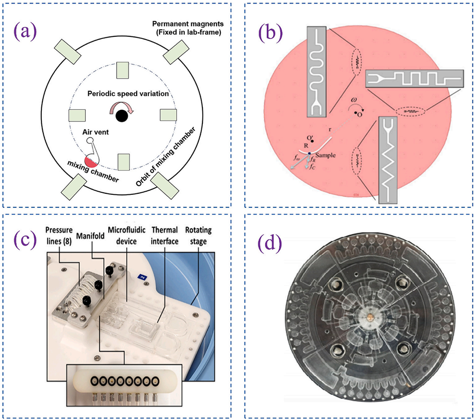 图 4. 四种快速混合方法:(a)通过周期性改变转速产生连续角加速度,进而生成欧拉力;(b)研究方形、弯曲和锯齿形通道的混合性能;(c)通过驱动压力在底部产生气泡,实现芯片主反应腔体内的液体混合;(d)结合离心力和电磁场控制,使液体与磁珠混合。