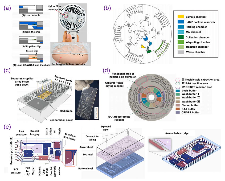 图 7. 离心微流控技术在生化检测中的应用:(a)用于水体细菌检测的离心微流控芯片;(b)用于五种高危型人乳头瘤病毒基因诊断的集成离心微流控系统;(c)用于食源性病原体识别与检测的离心微流控检测平台;(d)基于 CRISPR-Cas13a 的全集成离心微流控多重核酸检测平台;(e)用于样本到结果的病毒载量定量分析的集成离心微流控液滴数字 PCR(ddPCR)平台。