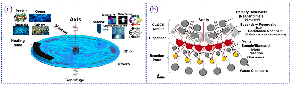 图 5. 用于高通量试剂分配的离心微流控芯片:(a)可实现多种试剂快速分配的床旁检测用离心微流控芯片;(b)离心驱动的多重酶联免疫吸附测定(ELISA)芯片,可自动分配多个样本。