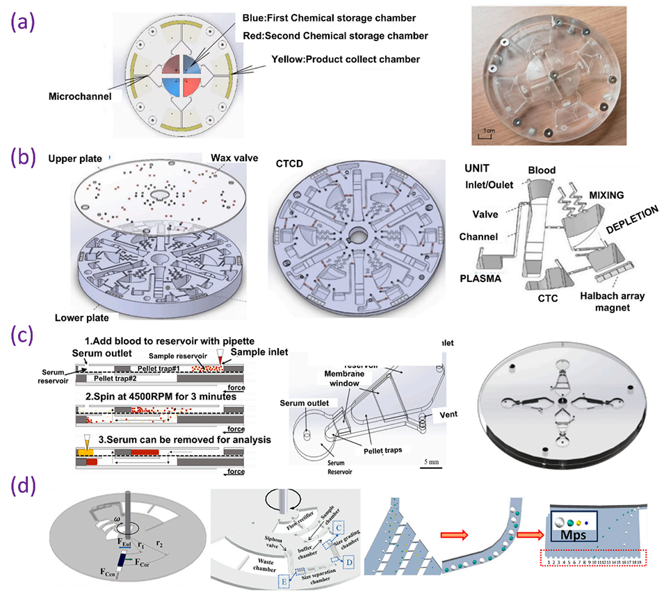 图 8. 用于材料合成与分离的离心微流控芯片:(a)利用离心微流控技术合成三氧化二镍纳米颗粒的新方法;(b)用于循环肿瘤细胞(CTCs)高效分离和全自动分析的连续离心微流控系统(CCM);(c)用于从全血中分离血清并保留两亲性生物标志物的新型离心微流控芯片;(d)用于微塑料(MPs)分离和检测的多级离心微流控芯片。