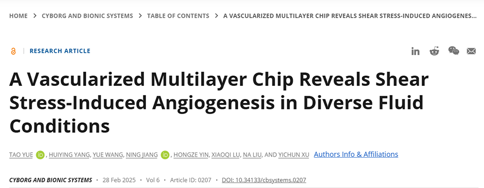 近期,上海大学机电工程与自动化学院岳涛副教授、刘娜副教授以及未来技术学院王越等人开发了一种基于聚碳酸酯多孔膜的三层微流控芯片,通过在单芯片上设计三角形、矩形和倒三角形组织腔室,实现了多种剪切应力环境下的血管化组织培养。该芯片成功构建了可稳定维持超10天的微血管网络,并通过灌注实验与流体模拟验证了间隙流方向和剪切应力对血管生长的关键调控作用。相关研究以“A Vascularized Multilayer Chip Reveals Shear Stress-Induced Angiogenesis in Diverse Fluid Conditions”为题目,发表在期刊《Cyborg and Bionic Systems》上。