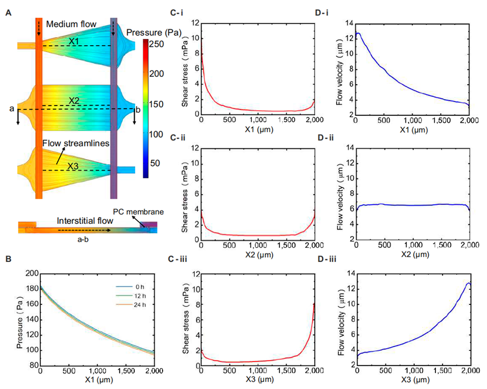 图 2. 组织腔内流体分布的模拟。(A)三种形状组织腔(三角形、矩形和倒三角形组织腔)的压力梯度分布和流动方向。(B)流体交换期间(t=0、12 和 24 小时)的压力梯度分布模拟结果。(C)沿(i)X1、(ii)X2 和(iii)X3 剖面线的剪切应力模拟结果。(D)沿(i)X1、(ii)X2 和(iii)X3 剖面线的流速模拟结果。