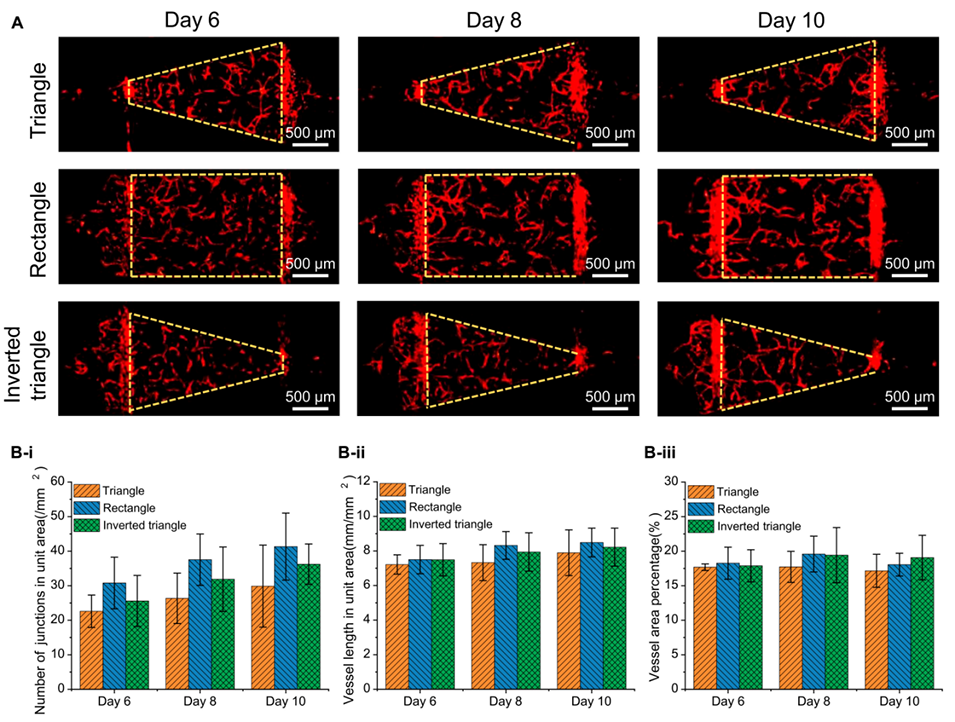 图 3. 多层微流控芯片中多形状微血管网络的生成。(A)在三种形状的组织腔(三角形、矩形和倒三角形组织腔)中,从第 6 天到第 10 天生成的微血管网络。(B)三种腔室在第 6 天、第 8 天和第 10 天的(i)单位面积连接点数、(ii)单位面积血管长度和(iii)血管面积百分比的定量分析(平均值±标准差,n=4)。