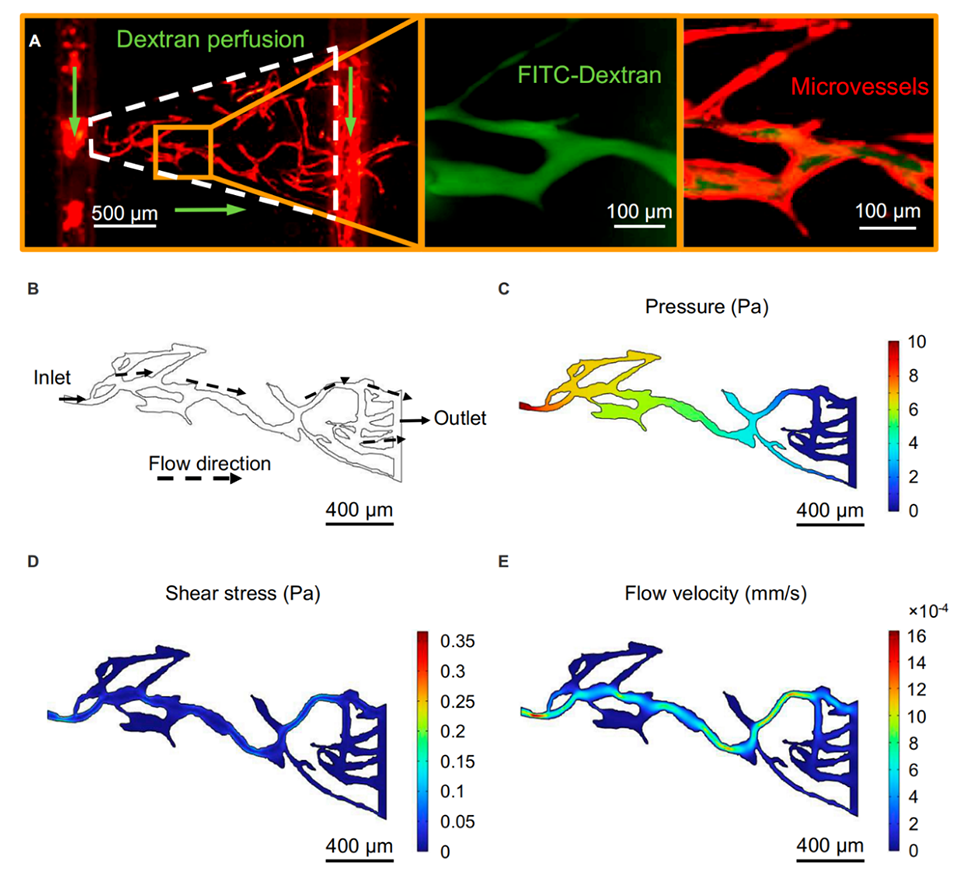 图 6. 微血管中 FITC - 葡聚糖的灌注以及微血管内流体压力、剪切应力和流速分布的模拟结果。(A)FITC - 葡聚糖成功灌注微血管且无明显泄漏。(B)通过图像处理提取的微血管轮廓。(C)微血管内的静水压力分布。(D)微血管内的剪切应力分布。(E)微血管内的流速分布。